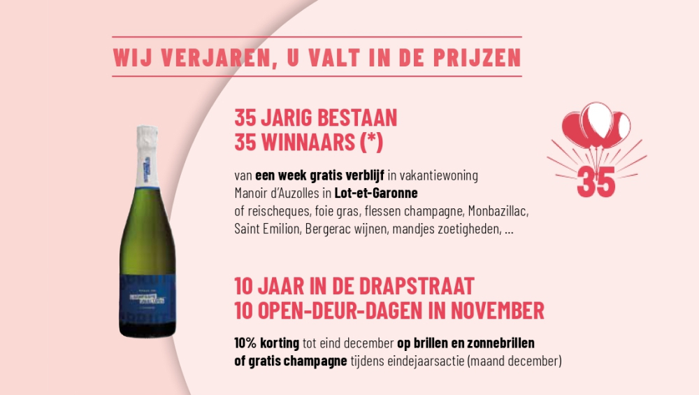 Dit jaar vieren we 35 jaar vol stijl, service en schitterende brillen! En omdat u deel uitmaakt van ons verhaal, delen we graag de feestvreugde met u.