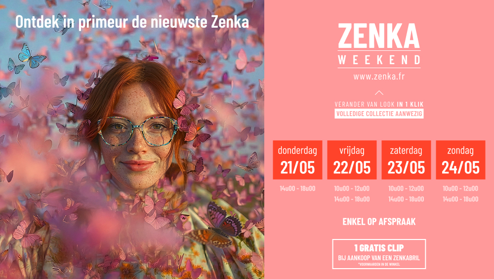 Bezoek ons op 23 (namiddag), 24, 25 en 26 (voormiddag) november en ontdek het Zenka aanbod. Bij aankoop van een Zenka bril ontvang je een gratis clip!