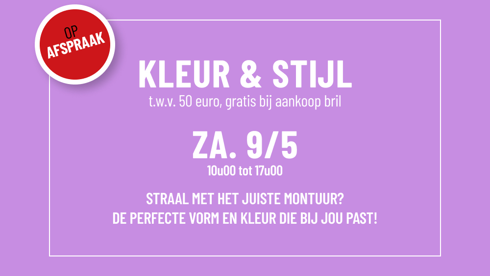 Ontdek op zaterdag 8 mei welke vorm en kleur perfect bij jou passen tijdens een exclusieve Kleur & Stijl-sessie (t.w.v. €50 – gratis bij aankoop van een bril). Stralend de juiste bril kiezen? Wij helpen je met persoonlijk kleur- en stijladvies op maat.