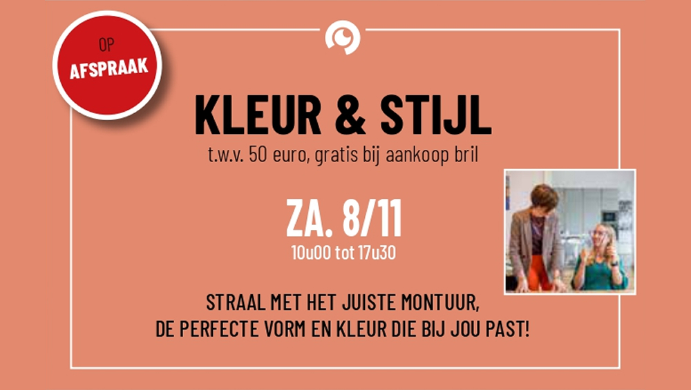 Ontdek op zaterdag 8 november welke vorm en kleur perfect bij jou passen tijdens een exclusieve Kleur & Stijl-sessie (t.w.v. €50 – gratis bij aankoop van een bril). Stralend de juiste bril kiezen? Wij helpen je met persoonlijk kleur- en stijladvies op maat.
