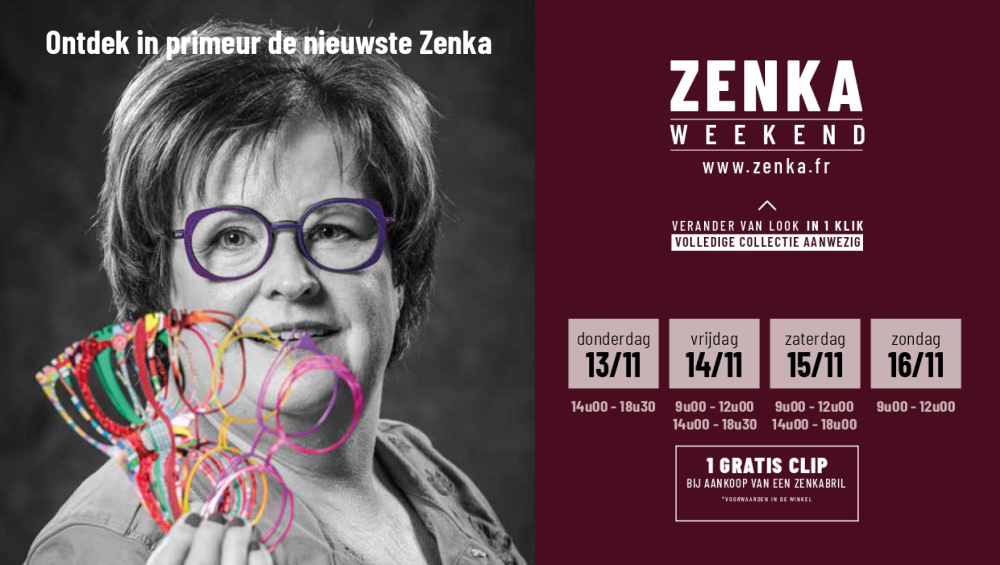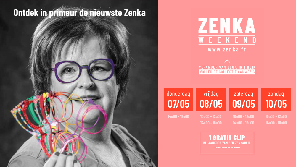 Kom zeker langs tijdens het Zenka weekend en bewonder de volledige collectie. Bij aankoop van een Zenka bril mag je bovendien 1 gratis clip uitkiezen.